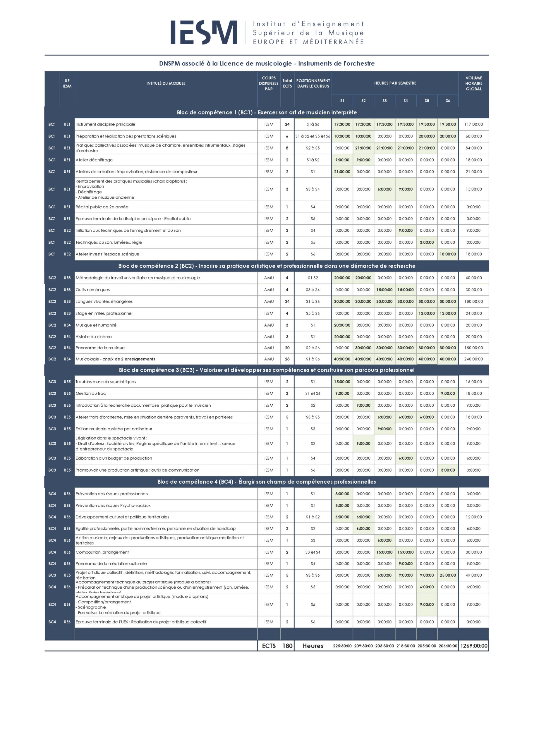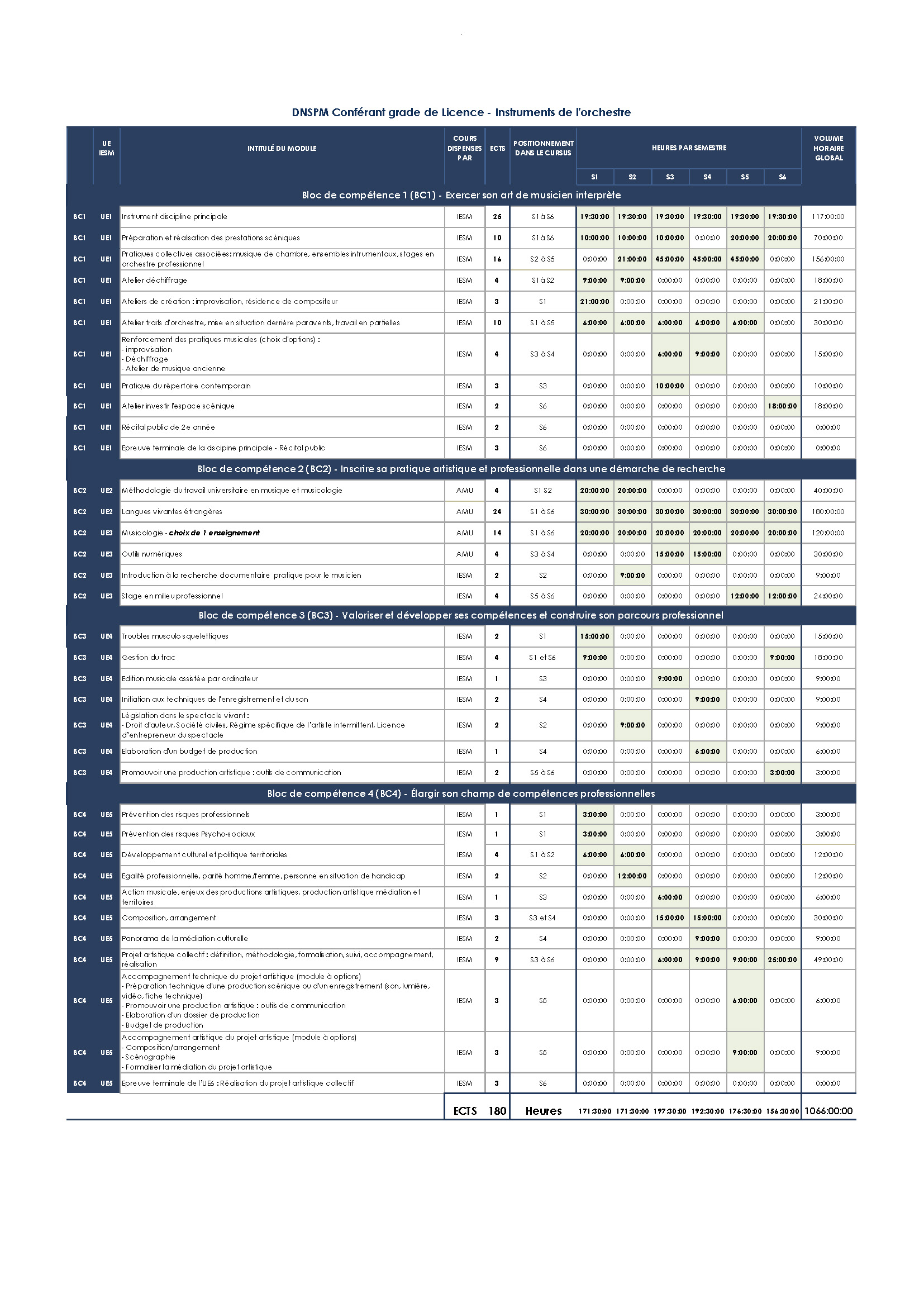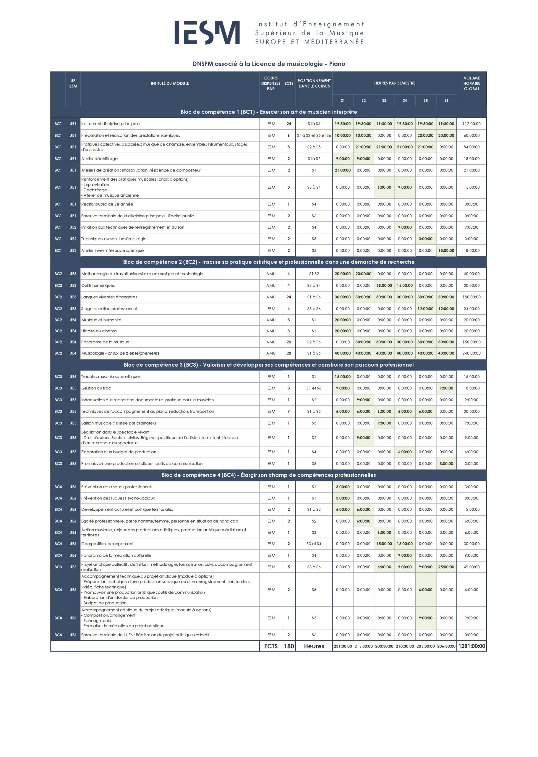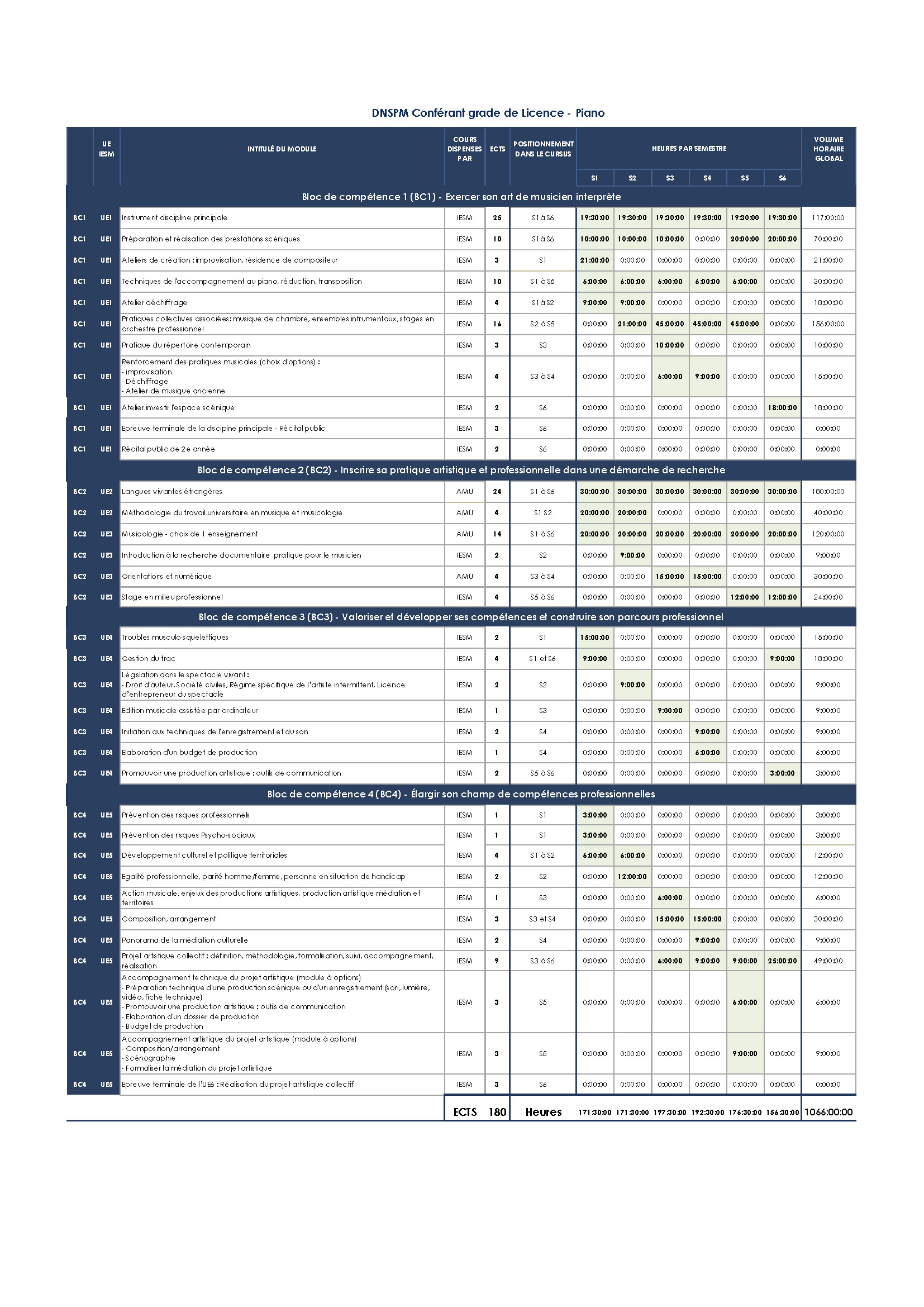 La durée normale du cursus est de 6 semestres. Cette durée peut être portée à 7 ou 8 semestres de suivi effectif du cursus DNSPM si l’étudiant doit repasser des UE ou autres cas exceptionnels.