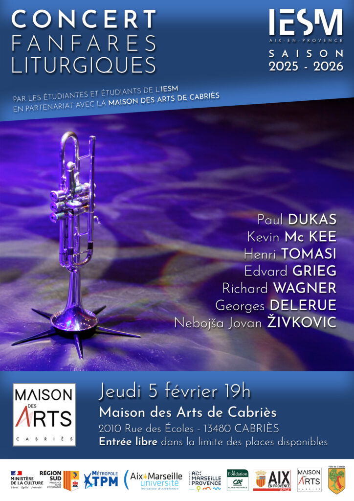 Acteur majeur de la Région SUD pour la formation supérieure des musiciens, de la création et de la diffusion musicale, l’Institut d’Enseignement Supérieur de la Musique (IESM) Europe et Méditerranée développe de multiples partenariats (Festival des Ecrivains du Sud, Festival de musique de Toulon et sa région, Festival Messiaen, Festival Présence Féminines, Orchestre National de Cannes, Orchestre National Avignon Provence, Musicatreize, Le Petit Duc, le Château d’Arnajon, etc.) favorisant, conjointement aux formations d’excellence dispensées par les plus grands pédagogues et interprètes à ces jeunes et talentueux artistes, l’insertion professionnelle et la pratique de la scène sous toutes ses formes.