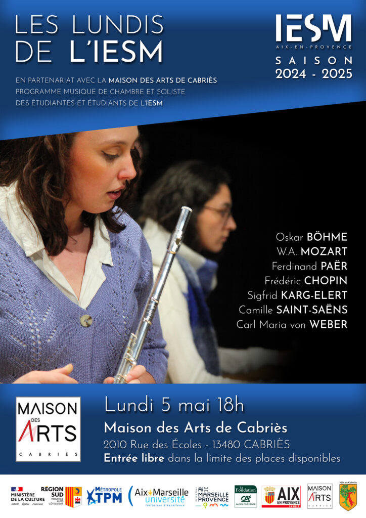 Acteur majeur de la Région SUD pour la formation supérieure des musiciens, de la création et de la diffusion musicale, l’Institut d’Enseignement Supérieur de la Musique (IESM) Europe et Méditerranée développe de multiples partenariats (Festival des Ecrivains du Sud, Festival de musique de Toulon et sa région, Festival Messiaen, Festival Présence Féminines, Orchestre National de Cannes, Orchestre National Avignon Provence, Musicatreize, Le Petit Duc, le Château d’Arnajon, etc.) favorisant, conjointement aux formations d’excellence dispensées par les plus grands pédagogues et interprètes à ces jeunes et talentueux artistes, l’insertion professionnelle et la pratique de la scène sous toutes ses formes.