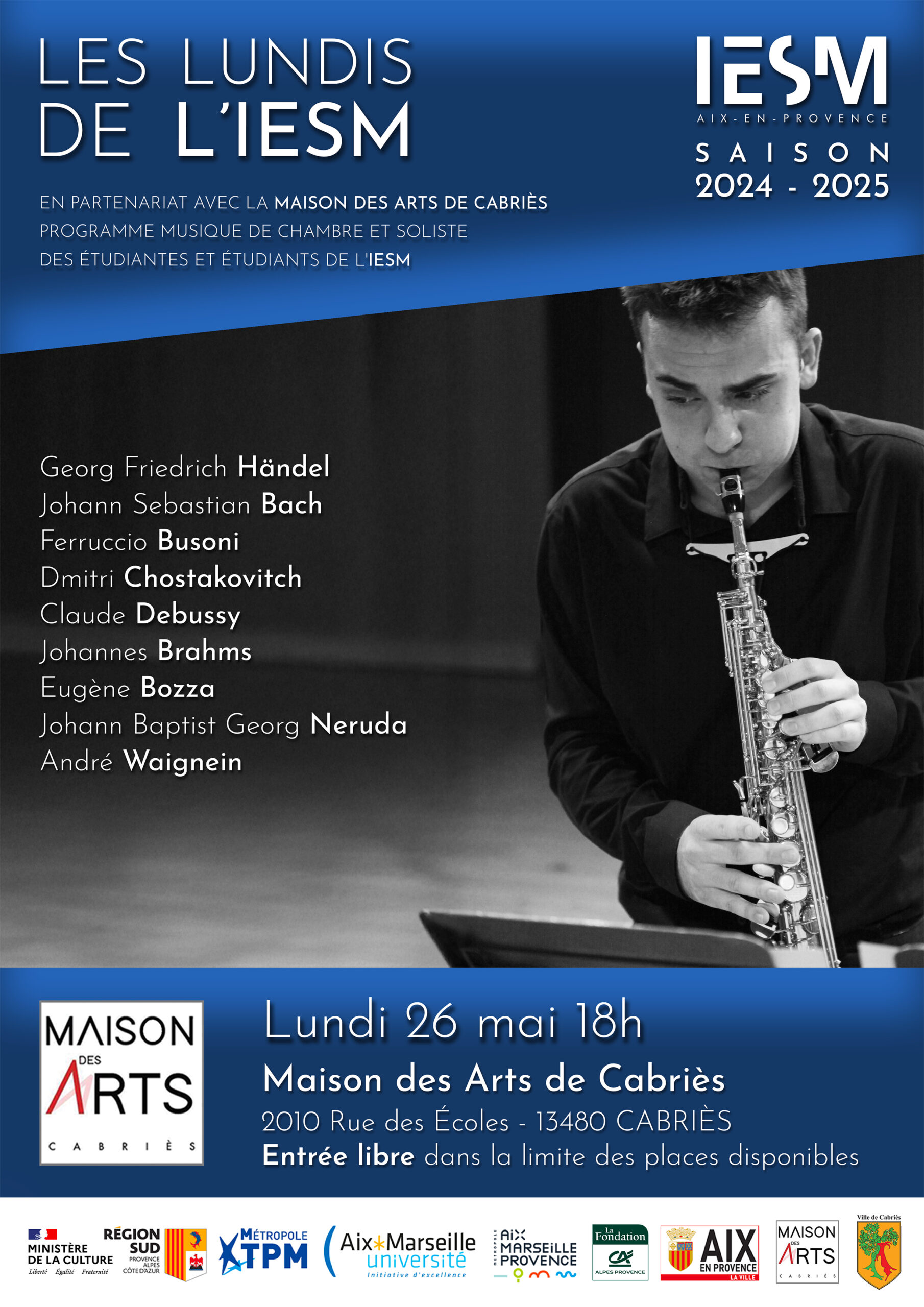 Ce lundi 16 juin 2025 à 18h, en partenariat avec la Maison des Arts de Cabriès, les étudiants de l' IESM  Aix-en-Provence se produisent à l'Auditorium Pierre Malbosc de la maison des arts pour la dernière date de la saison 2024-2025 -- programme à venir -- Consultez régulièrement nos pages facebook ou instagram https://www.facebook.com/Iesm.fr/ https://www.instagram.com/iesmaix/ […]