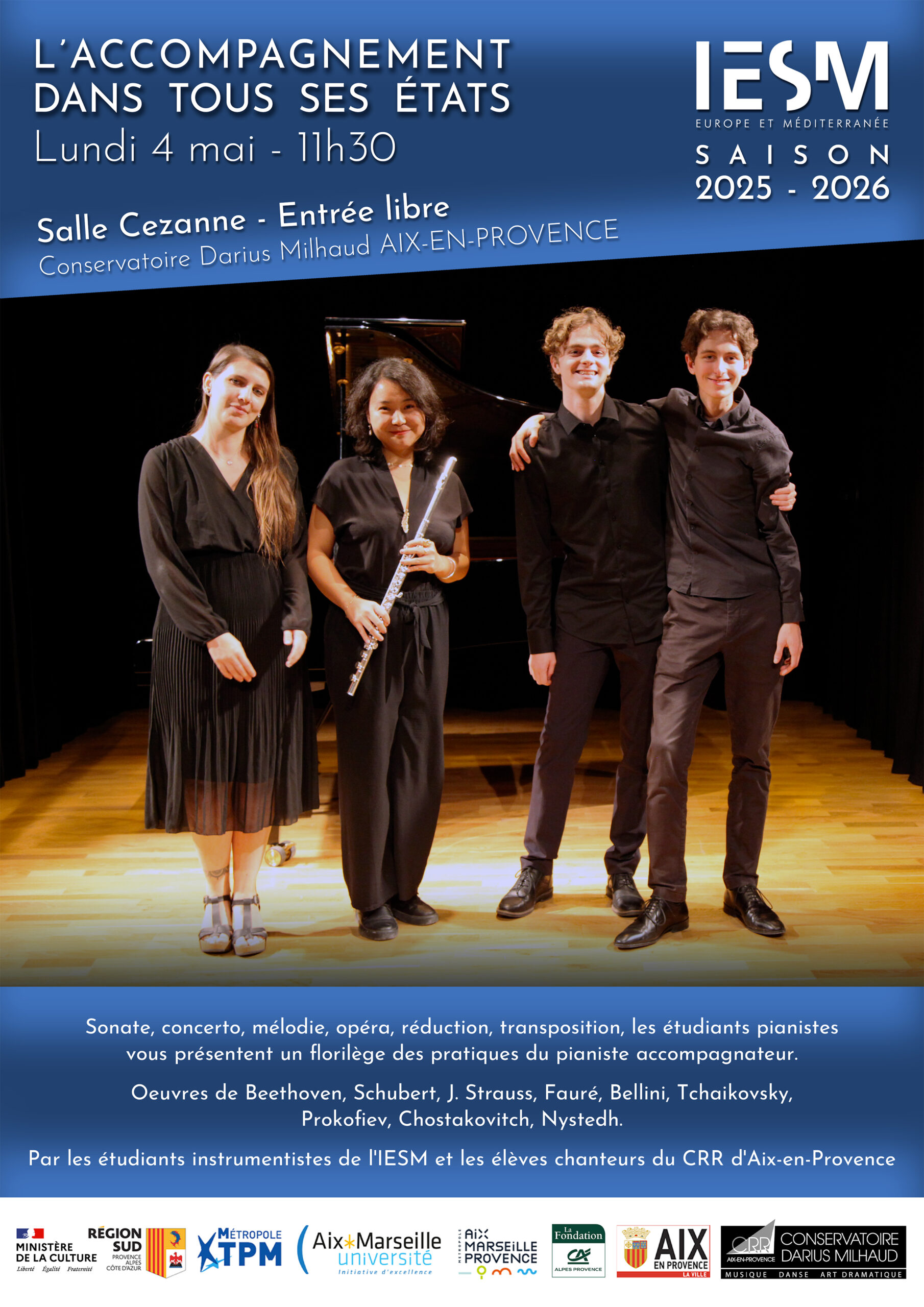Mai 4 11 h 30 min - 12 h 45 min L’accompagnement dans tous ses états – Les Lundis de l’IESM au CRR d’Aix – 4 mai 2026 – 11h30 en salle Cézanne Gratuit