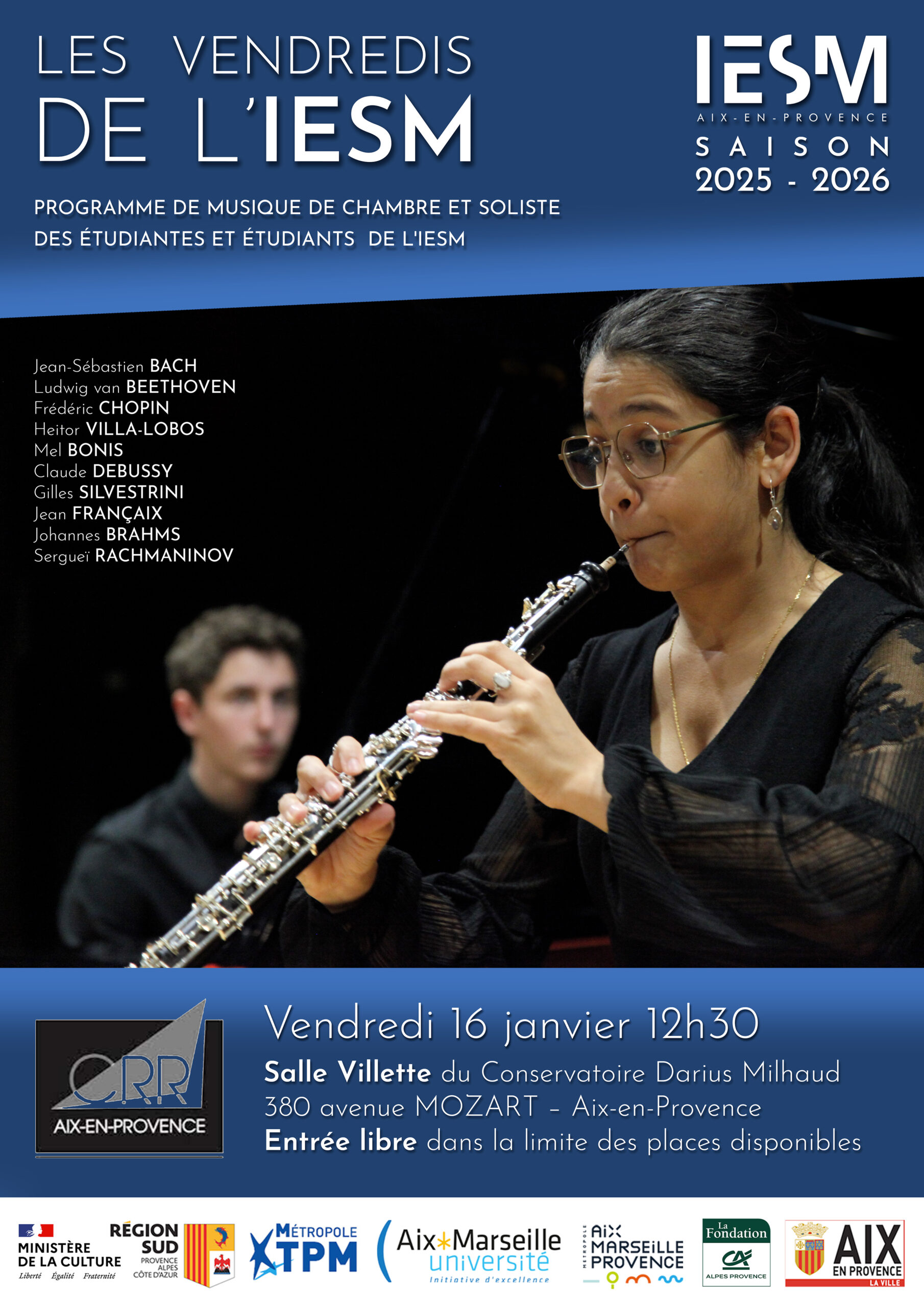 Jan 16 12 h 30 min - 13 h 30 min Les Vendredis de l’IESM au CRR d’Aix – musique de chambre et soliste – 16 janvier 2026 – 12h30 en salle Villette Gratuit